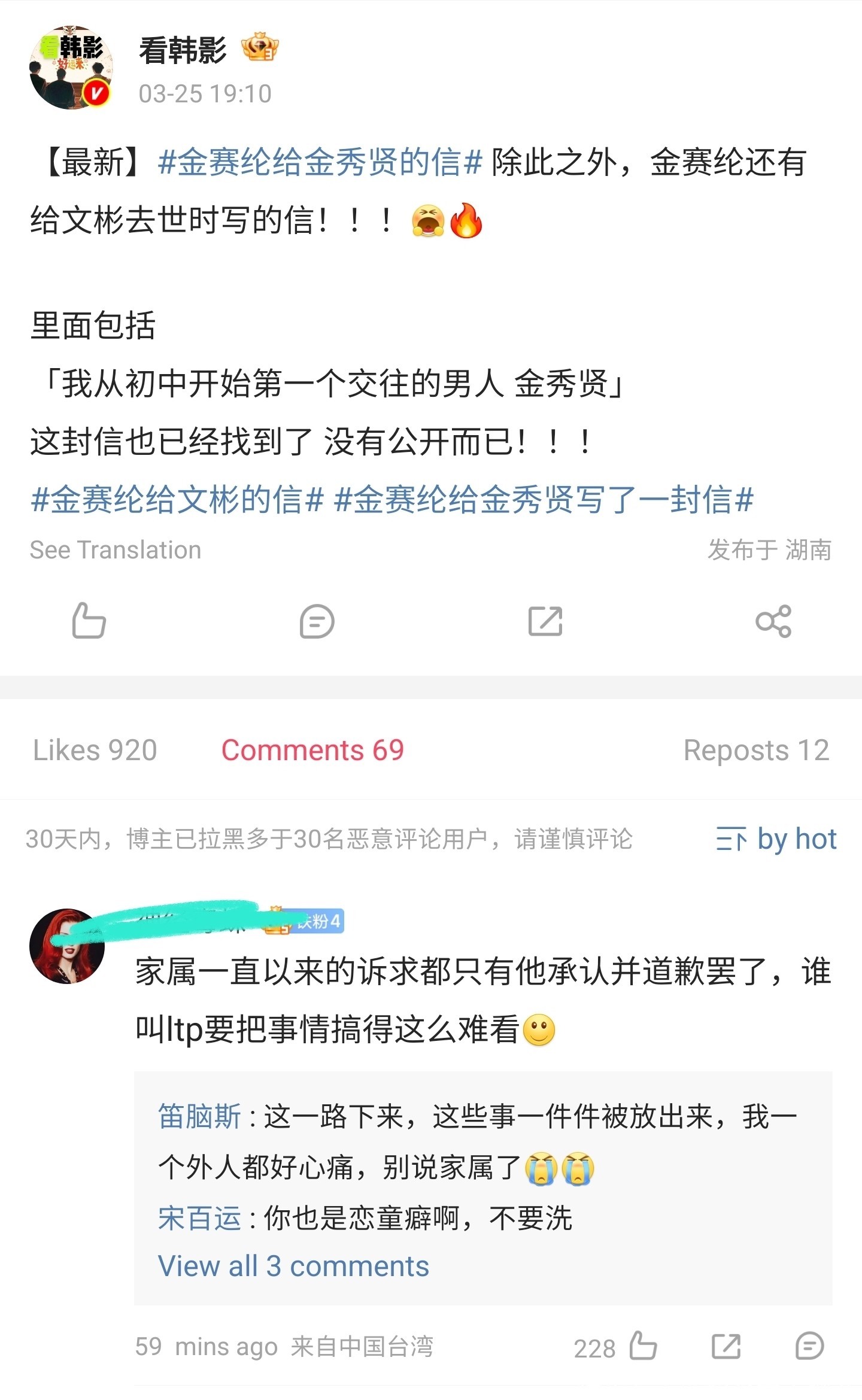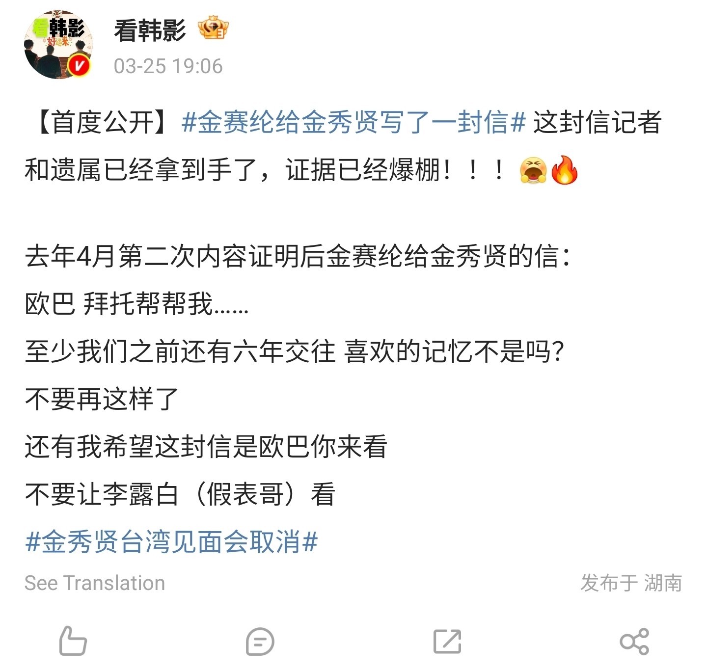 而直接委托媒体放了“大招”,拿出了金赛纶生前的几封私密信件,怒斥金秀贤撒谎。